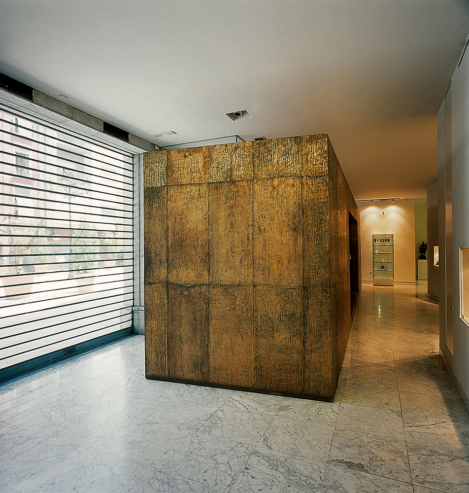 La caja de bronce, totalmente exenta, permite que la luz natural resbale por sus bordes impregnando todo el espacio interior de la calidez desprendida de este material. Sus diemnciones y ángulos se ajustaron en obra para conseguir perspectivas más naturales y una escala adecuada a cada posición, quedando fijadas en 10.60m. de espesor, con una textura de martilleado irregular que nos aproxima al trabajo minucioso del joyero. Todas las placas reproducen un modelo, pero cada una es distinta a las demás en sus imperfecciones, propias de la fundición, lo que nos recuerda a los objetos de los anticuarios que existieron hace tiempo en éste lugar.